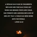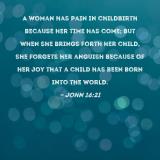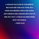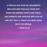 A woman has pain in childbirth because her time has come; but when she brings forth her child, she forgets her anguish because of her joy that a child has been born into the world.