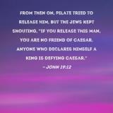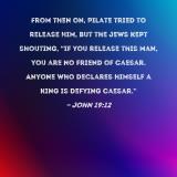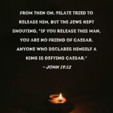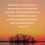 From then on, Pilate tried to release Him, but the Jews kept shouting, "If you release this man, you are no friend of Caesar. Anyone who declares himself a king is defying Caesar."