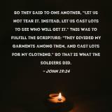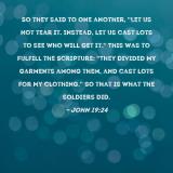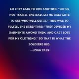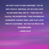 Pictures and Artwork So they said to one another, "Let us not tear it. Instead, let us cast lots to see who will get it." This was to fulfill the Scripture: "They divided My garments among them, and cast lots for My clothing." So that is what the soldiers did. |