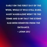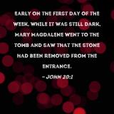 Early on the first day of the week, while it was still dark, Mary Magdalene went to the tomb and saw that the stone had been removed from the entrance.