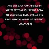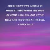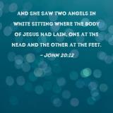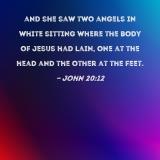 and she saw two angels in white sitting where the body of Jesus had lain, one at the head and the other at the feet.