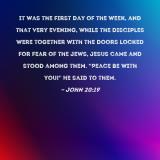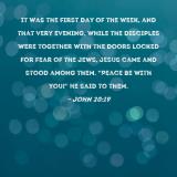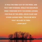 It was the first day of the week, and that very evening, while the disciples were together with the doors locked for fear of the Jews, Jesus came and stood among them. "Peace be with you!" He said to them.
