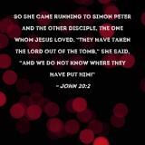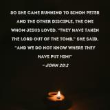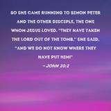 So she came running to Simon Peter and the other disciple, the one whom Jesus loved. "They have taken the Lord out of the tomb," she said, "and we do not know where they have put Him!"