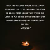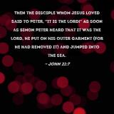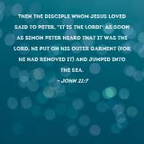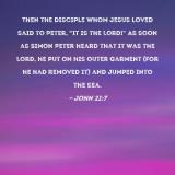 Then the disciple whom Jesus loved said to Peter, "It is the Lord!" As soon as Simon Peter heard that it was the Lord, he put on his outer garment (for he had removed it) and jumped into the sea.