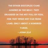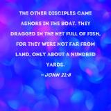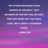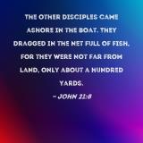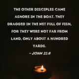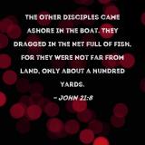 The other disciples came ashore in the boat. They dragged in the net full of fish, for they were not far from land, only about a hundred yards.