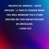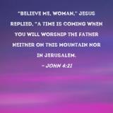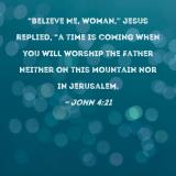 "Believe Me, woman," Jesus replied, "a time is coming when you will worship the Father neither on this mountain nor in Jerusalem.