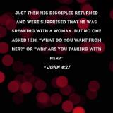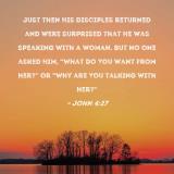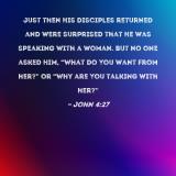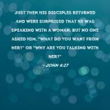 Just then His disciples returned and were surprised that He was speaking with a woman. But no one asked Him, "What do You want from her?" or "Why are You talking with her?"