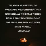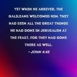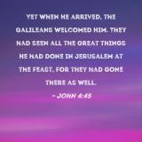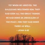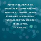 Yet when He arrived, the Galileans welcomed Him. They had seen all the great things He had done in Jerusalem at the feast, for they had gone there as well.