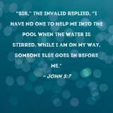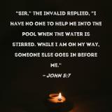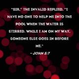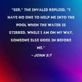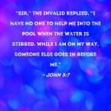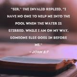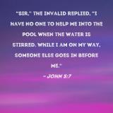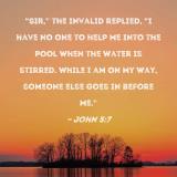 "Sir," the invalid replied, "I have no one to help me into the pool when the water is stirred. While I am on my way, someone else goes in before me."