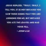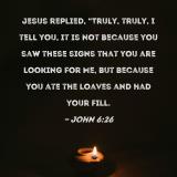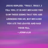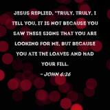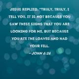 Jesus replied, "Truly, truly, I tell you, it is not because you saw these signs that you are looking for Me, but because you ate the loaves and had your fill.
