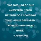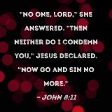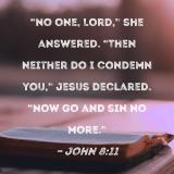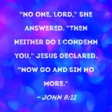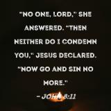 "No one, Lord," she answered. "Then neither do I condemn you," Jesus declared. "Now go and sin no more."