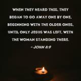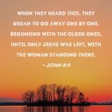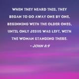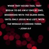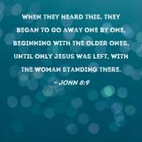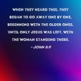 When they heard this, they began to go away one by one, beginning with the older ones, until only Jesus was left, with the woman standing there.