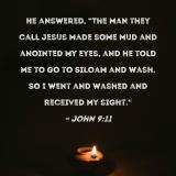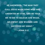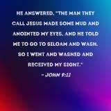 He answered, "The man they call Jesus made some mud and anointed my eyes, and He told me to go to Siloam and wash. So I went and washed and received my sight."