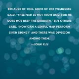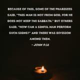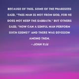 Because of this, some of the Pharisees said, "This man is not from God, for He does not keep the Sabbath." But others said, "How can a sinful man perform such signs?" And there was division among them.