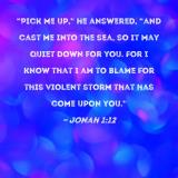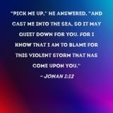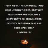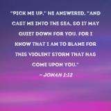 "Pick me up," he answered, "and cast me into the sea, so it may quiet down for you. For I know that I am to blame for this violent storm that has come upon you."