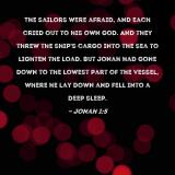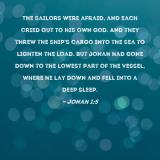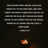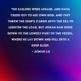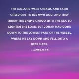 The sailors were afraid, and each cried out to his own god. And they threw the ship's cargo into the sea to lighten the load. But Jonah had gone down to the lowest part of the vessel, where he lay down and fell into a deep sleep.