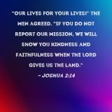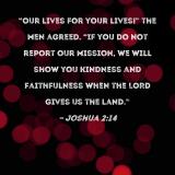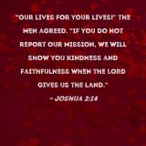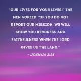 "Our lives for your lives!" the men agreed. "If you do not report our mission, we will show you kindness and faithfulness when the LORD gives us the land."