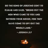 So the king of Jericho sent to Rahab and said, "Bring out the men who came to you and entered your house, for they have come to spy out the whole land."