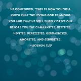 He continued, "This is how you will know that the living God is among you and that He will surely drive out before you the Canaanites, Hittites, Hivites, Perizzites, Girgashites, Amorites, and Jebusites.