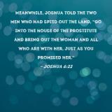 Meanwhile, Joshua told the two men who had spied out the land, "Go into the house of the prostitute and bring out the woman and all who are with her, just as you promised her."