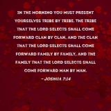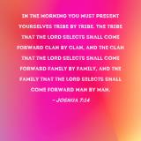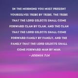 Pictures and Artwork In the morning you must present yourselves tribe by tribe. The tribe that the LORD selects shall come forward clan by clan, and the clan that the LORD selects shall come forward family by family, and the family that the LORD selects shall come forward man by man. |