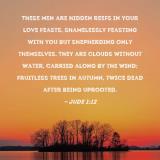 These men are hidden reefs in your love feasts, shamelessly feasting with you but shepherding only themselves. They are clouds without water, carried along by the wind; fruitless trees in autumn, twice dead after being uprooted.