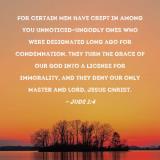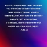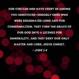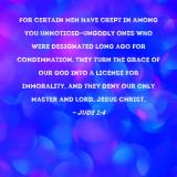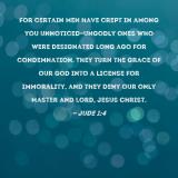 For certain men have crept in among you unnoticed--ungodly ones who were designated long ago for condemnation. They turn the grace of our God into a license for immorality, and they deny our only Master and Lord, Jesus Christ.