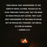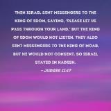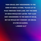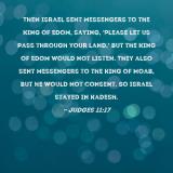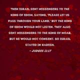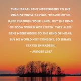 Pictures and Artwork Then Israel sent messengers to the king of Edom, saying, 'Please let us pass through your land,' but the king of Edom would not listen. They also sent messengers to the king of Moab, but he would not consent. So Israel stayed in Kadesh. |