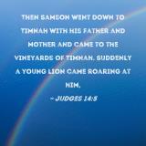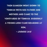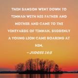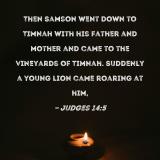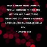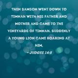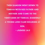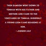 Then Samson went down to Timnah with his father and mother and came to the vineyards of Timnah. Suddenly a young lion came roaring at him,