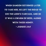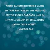 When Samson returned later to take her, he left the road to see the lion's carcass, and in it was a swarm of bees, along with their honey.