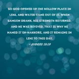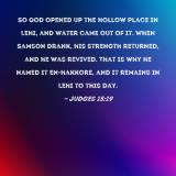 So God opened up the hollow place in Lehi, and water came out of it. When Samson drank, his strength returned, and he was revived. That is why he named it En-hakkore, and it remains in Lehi to this day.