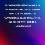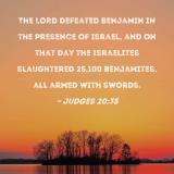 The LORD defeated Benjamin in the presence of Israel, and on that day the Israelites slaughtered 25,100 Benjamites, all armed with swords.
