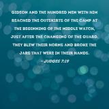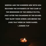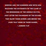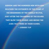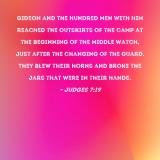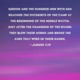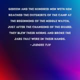 Gideon and the hundred men with him reached the outskirts of the camp at the beginning of the middle watch, just after the changing of the guard. They blew their horns and broke the jars that were in their hands.