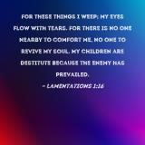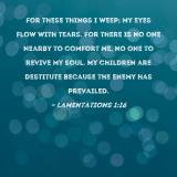 For these things I weep; my eyes flow with tears. For there is no one nearby to comfort me, no one to revive my soul. My children are destitute because the enemy has prevailed.
