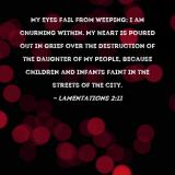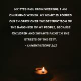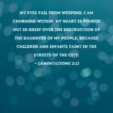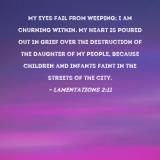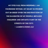My eyes fail from weeping; I am churning within. My heart is poured out in grief over the destruction of the daughter of my people, because children and infants faint in the streets of the city.