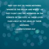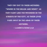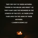 They cry out to their mothers: "Where is the grain and wine?" as they faint like the wounded in the streets of the city, as their lives fade away in the arms of their mothers.