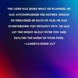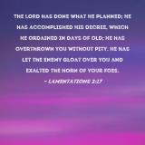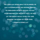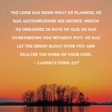 The LORD has done what He planned; He has accomplished His decree, which He ordained in days of old; He has overthrown you without pity. He has let the enemy gloat over you and exalted the horn of your foes.