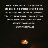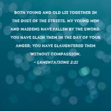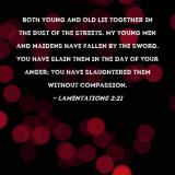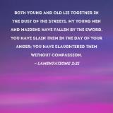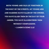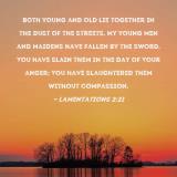 Both young and old lie together in the dust of the streets. My young men and maidens have fallen by the sword. You have slain them in the day of Your anger; You have slaughtered them without compassion.