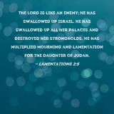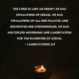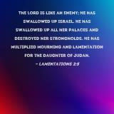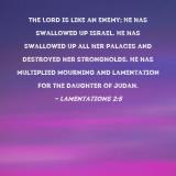The Lord is like an enemy; He has swallowed up Israel. He has swallowed up all her palaces and destroyed her strongholds. He has multiplied mourning and lamentation for the Daughter of Judah.