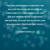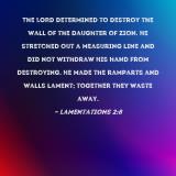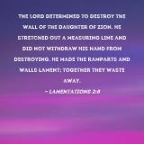 The LORD determined to destroy the wall of the Daughter of Zion. He stretched out a measuring line and did not withdraw His hand from destroying. He made the ramparts and walls lament; together they waste away.