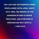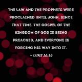 The Law and the Prophets were proclaimed until John. Since that time, the gospel of the kingdom of God is being preached, and everyone is forcing his way into it.