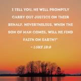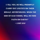 I tell you, He will promptly carry out justice on their behalf. Nevertheless, when the Son of Man comes, will He find faith on earth?"