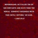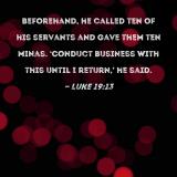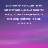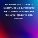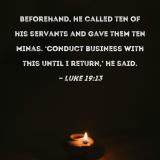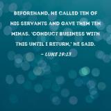 Beforehand, he called ten of his servants and gave them ten minas. 'Conduct business with this until I return,' he said.