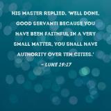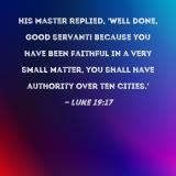 His master replied, 'Well done, good servant! Because you have been faithful in a very small matter, you shall have authority over ten cities.'