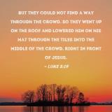 but they could not find a way through the crowd. So they went up on the roof and lowered him on his mat through the tiles into the middle of the crowd, right in front of Jesus.