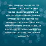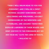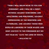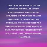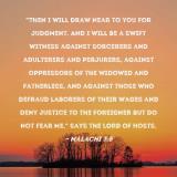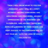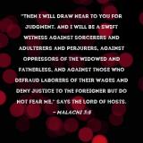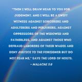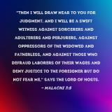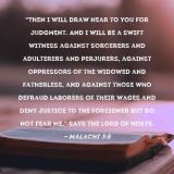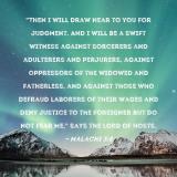Pictures and Artwork "Then I will draw near to you for judgment. And I will be a swift witness against sorcerers and adulterers and perjurers, against oppressors of the widowed and fatherless, and against those who defraud laborers of their wages and deny justice to the foreigner but do not fear Me," says the LORD of Hosts. |