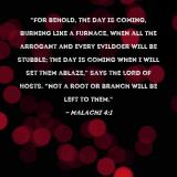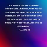 Pictures and Artwork "For behold, the day is coming, burning like a furnace, when all the arrogant and every evildoer will be stubble; the day is coming when I will set them ablaze," says the LORD of Hosts. "Not a root or branch will be left to them." |