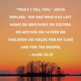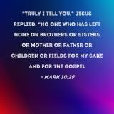 "Truly I tell you," Jesus replied, "no one who has left home or brothers or sisters or mother or father or children or fields for My sake and for the gospel