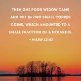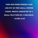 Then one poor widow came and put in two small copper coins, which amounted to a small fraction of a denarius.