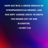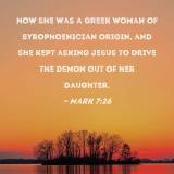 Now she was a Greek woman of Syrophoenician origin, and she kept asking Jesus to drive the demon out of her daughter.